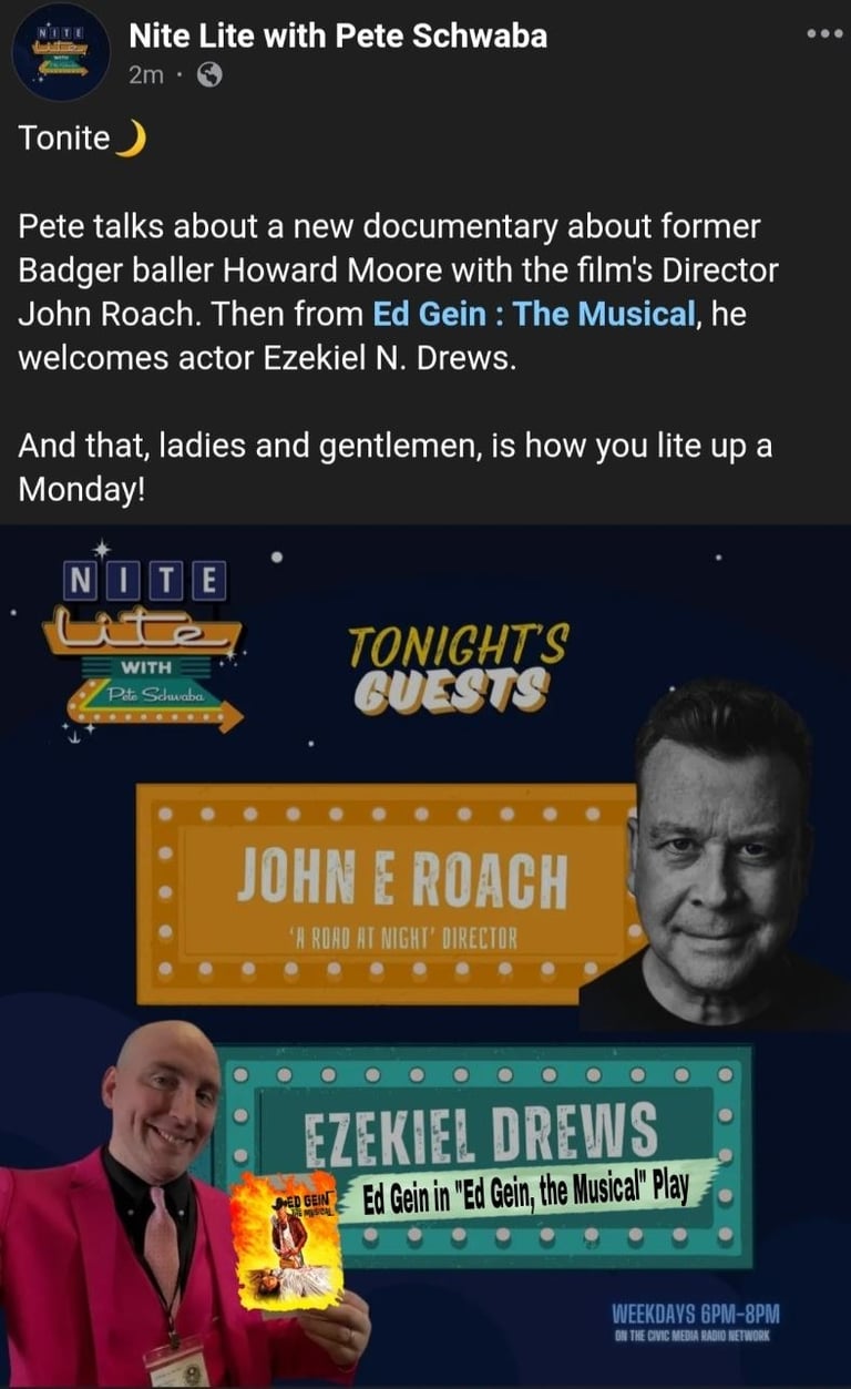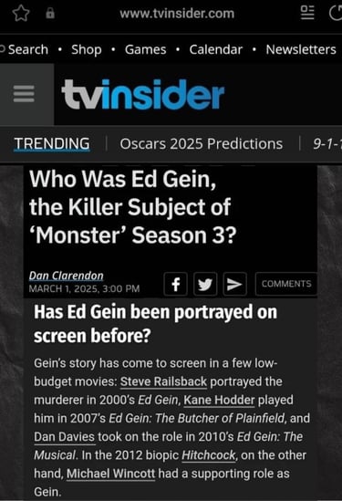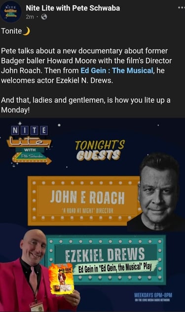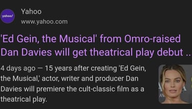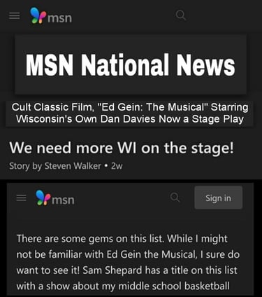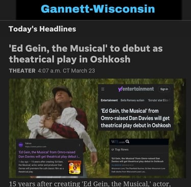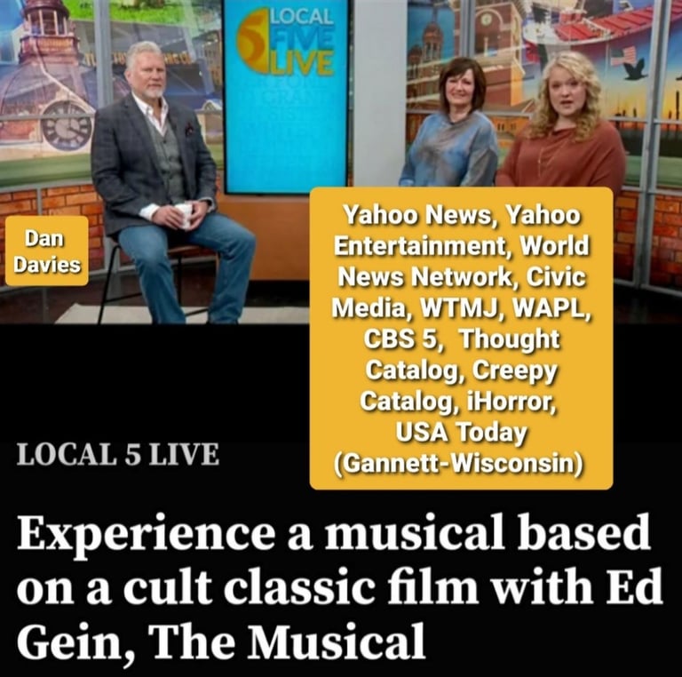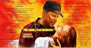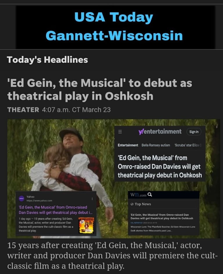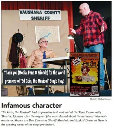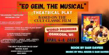 Join us for the world premiere of the theatrical adaptation of the cult classic film "Ed Gein, The Musical". This play features the talents of Dan Davies, Ezekiel N. Drews and a great cast! (April 4th - 6th, 2025 in Oshkosh, WI) This version, written by Dan Davies, has a few new songs and really ventures into why Ed became a deranged & derelict man.