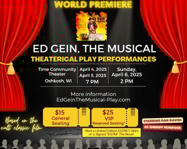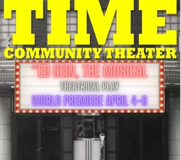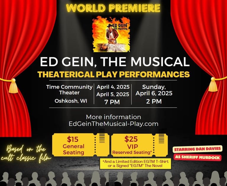 Join us for the world premiere of "Ed Gein, the Musical" at the Time Community Theater, Oshkosh, WI, from April 4th to 6th, 2025.