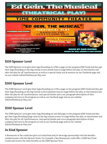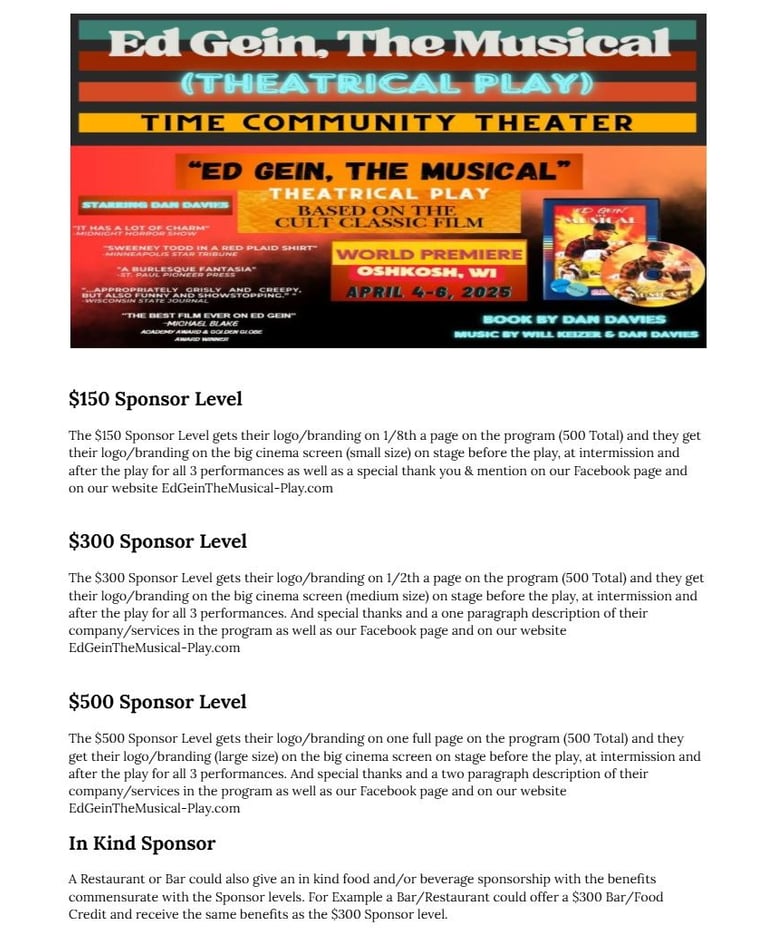 Our Sponsors are Amazing! Find out about sponsoring "Ed Gein, The Musical" The Play for as little as $150! It's a great way to support the local NE Wisconsin Arts Community!